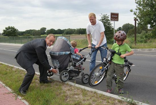 Felix Menzel und Sven Szramek mit seinen Kindern bei der Überquerung der L96 (v.l.) Bordsteinabsenkung östlich der Stremmebrücke kommt im Herbst