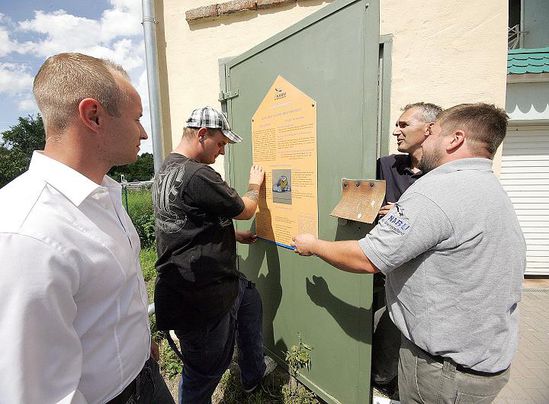 Felix Menzel, Marcel Raytscheff, René Riep und Tino Wachowiak beim Anbringen des Schildes (v.l.) Buckower Einwohner legten selbst Hand an