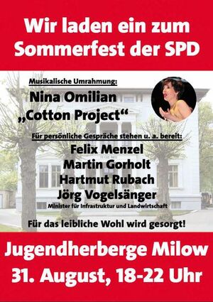 Die SPD Rathenow/ Milower Land richtet in diesem Jahr ihr traditionelles Sommerfest auf dem Gelände der Jugendherberge Milow aus.